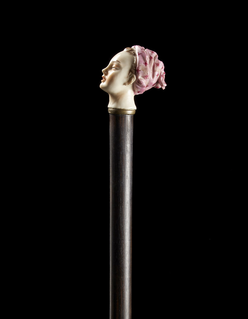 Bastone con canna in ebano e impugnatura in porcellana a testa femminile decorata in policromia. Ghiera in metallo dorato. Francia, sec. XIX An ebony walking stick with porcelain handle. Gilt metal collar. France, 19th century