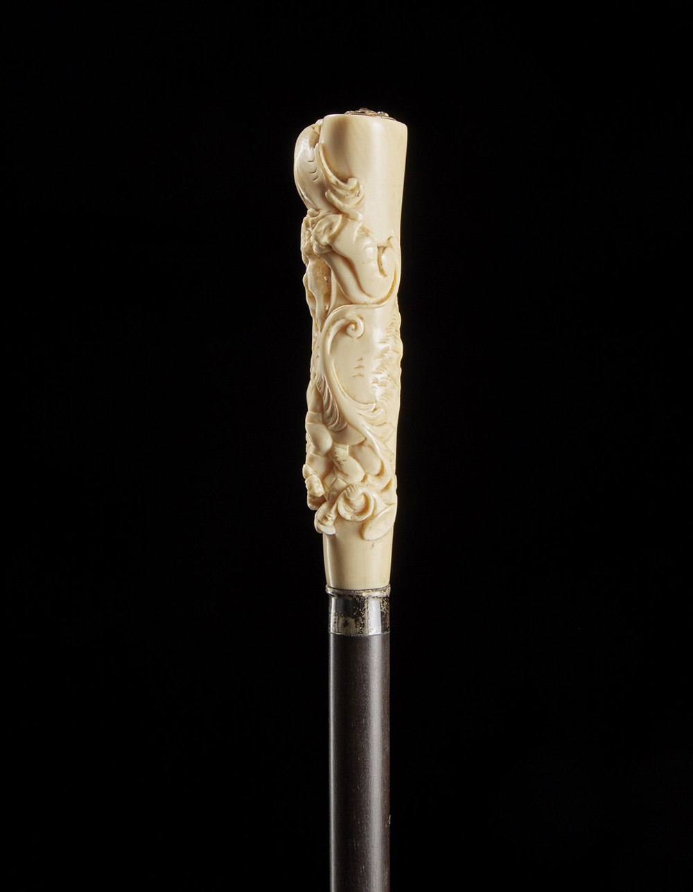 Bastone con canna in ebano e presa in avorio intagliato con scena di caccia...