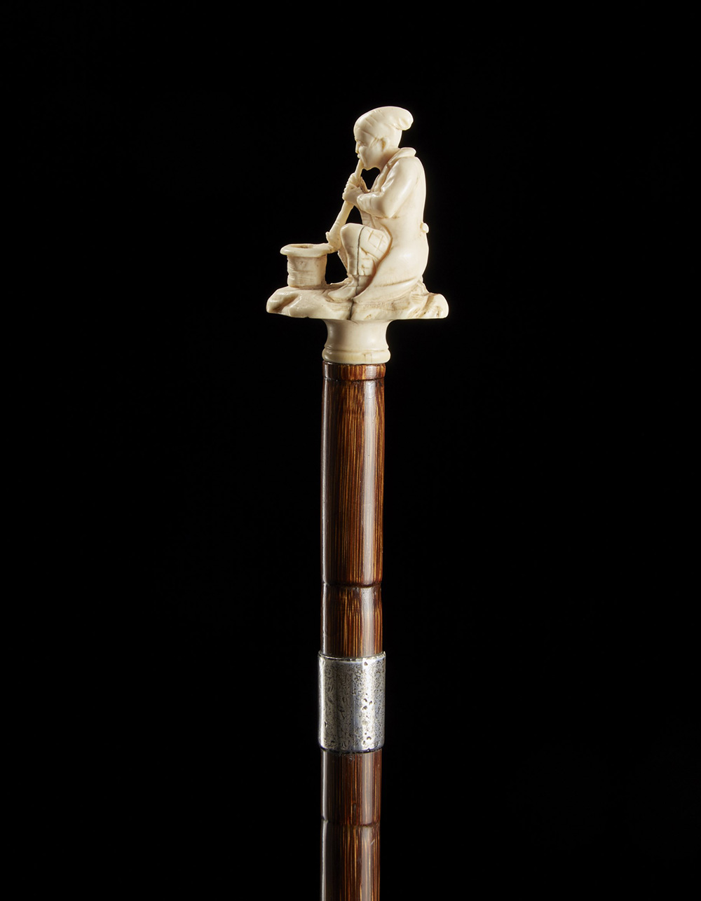 Bastone con canna in bamboo sormontata da presa in avorio scolpito a incantatore di serpenti assiso. Ghiera in argento. Punzone di Birmingham 1781 (?) (punzoni abrasi) A bamboo walking stick with ivory handle. Silver collar- Birmingham, 1781 (?) (abrasion to the silver mark)