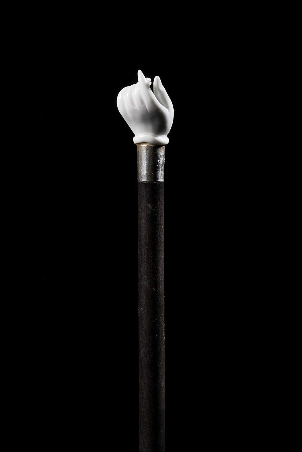 Bastone con canna in ebano e presa in porcellana a forma di mano. Ghiera in argento. Puntale in metallo An ebony walking stick with porcelain handle. Silver collar and metal tip