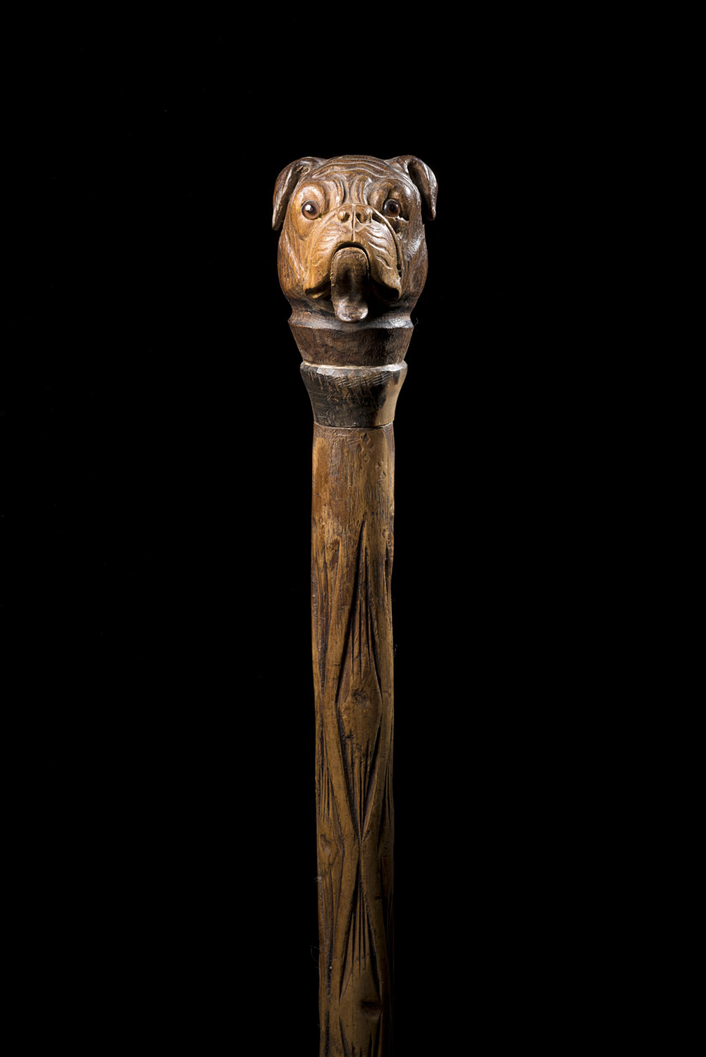 Bastone con canna in legno intagliato a motivi geometrici, presa con testa di bulldog con bocca apribile e occhi in vetro. Ghiera in corno. Sec. XIX A wood walking stick with horn collar. 19th century