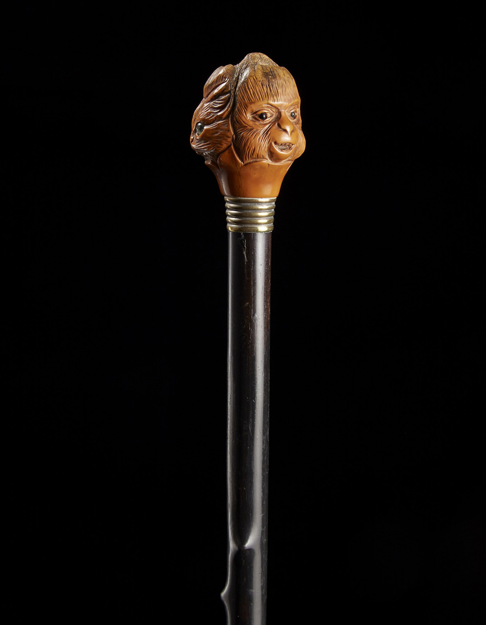 Bastone con canna in legno di frutto e pomolo scolpito da un seme con teste di civetta, lince e scimmia. Sec. XIX (difetti) A wood walking stick with seed handle. 19th century (defects)