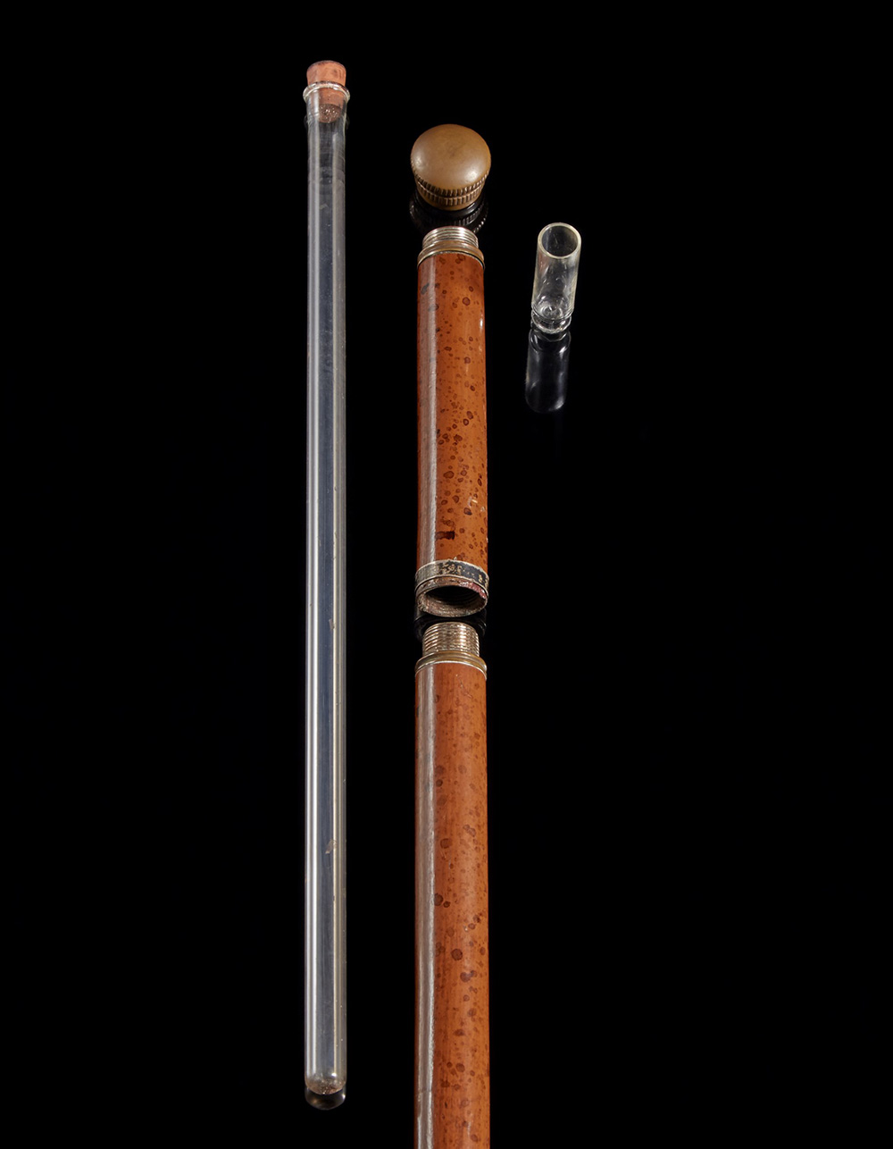 Bastone in legno tornito con tappo e ghiere in rame celanti fiaschetta e bicchieri in vetro. Sec. XIX (difetti) A wood walking stick with copper handle and collar, containing flask and glasses. 19th century (defects)