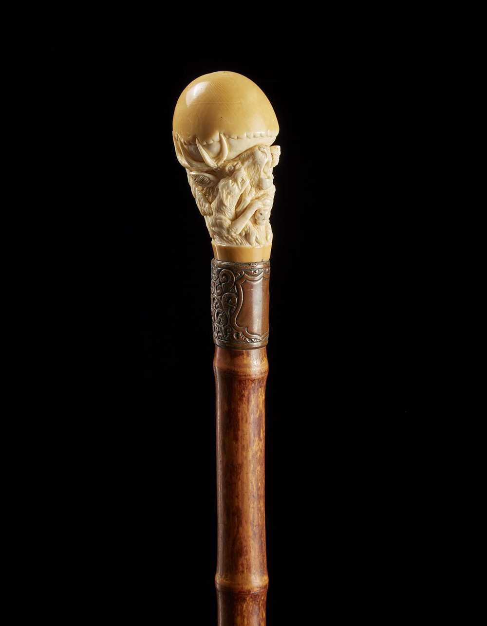 Bastone con canna in bamboo e impugnatura in avorio scolpito con scena di...