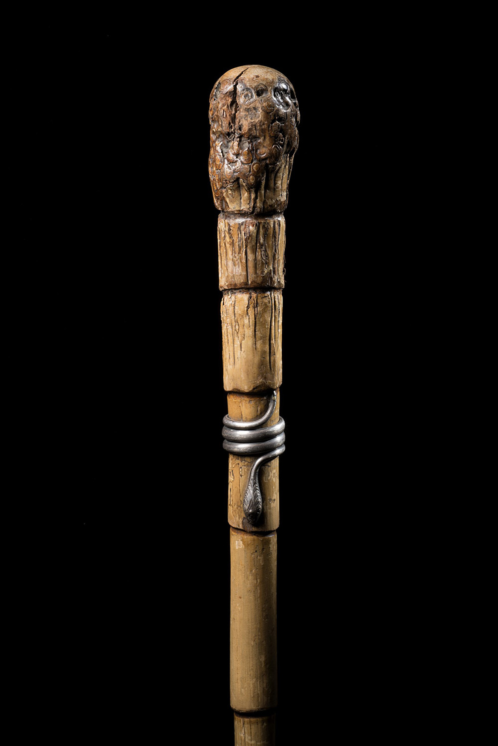 Bastone con canna in bamboo e presa decorata da ghiera in argento a forma di serpente avviluppato. Punzoni non decifrati. Fine sec. XIX (difetti) A bamboo walking stick with snake-shaped silver collar. Late 19th century (defects)