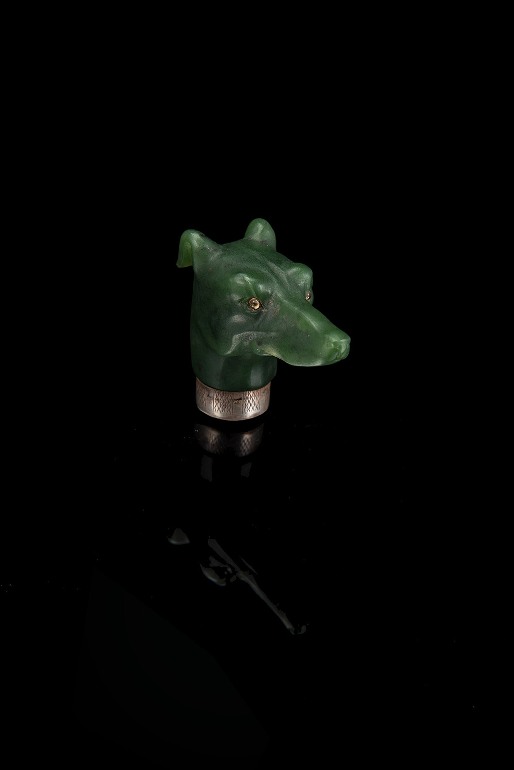 Impugnatura per bastone in giada variet‡ nefrite scolpita a testa di levriero con occhi in vetro. Ghiera in metallo argentato. A jade walking stick handle with silvered metal collar