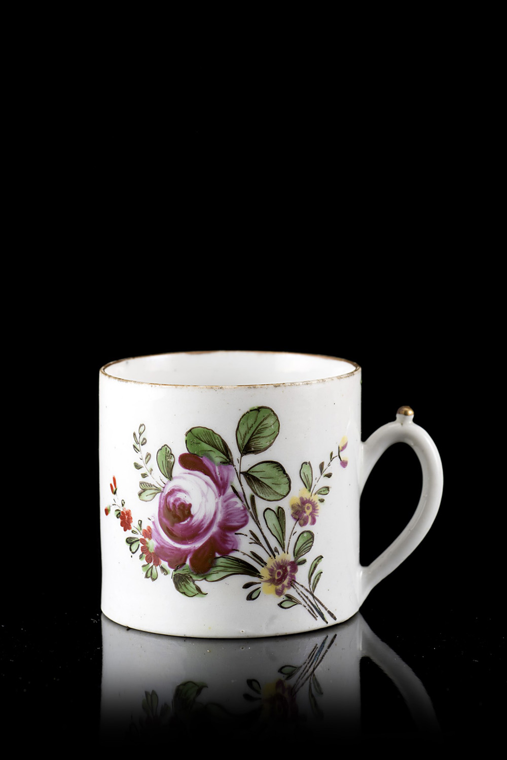 Tazzina da caffË cilindrica in porcellana con manico a voluta con pomello. Decorazione policroma a fiori. Marca di fabbrica. Venezia, manifattura Cozzi, sec. XVIII (profili in oro usurati) A porcelain cup. Venice, Cozzi manufacture, 18th century (wear to the gilt)