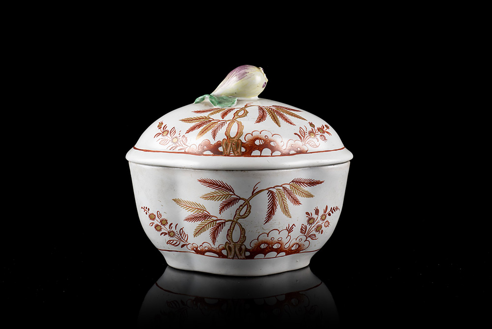 Zuccheriera con coperchio in porcellana decorata "a galletto" in monocromia rosso ferro e rialzi in oro. Pomolo del coperchio in policromia foggiato a pera. Ginori, sec. XVIII/XIX (restauri) A porcelain sugar bowl with cover. Ginori manufacture, 18th/19th century