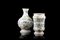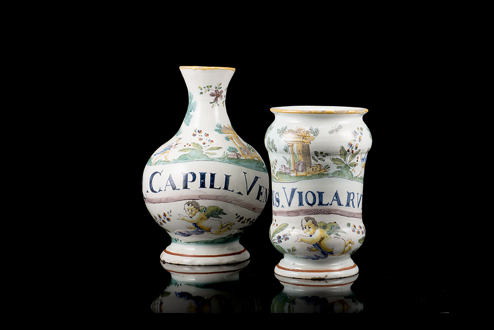 Un albarello (h. cm 20) ed una bottiglia farmaceutica (h. cm 24) in maiolica decorati in policromia con decorazione a "rovine con figure". Líalbarello Ë attraversato dal cartiglio farmaceutico con la scritta del contenuto "Cons. Violarum" in lettere capitali brune; mentre la bottiglia contiene "Aq. Capill. Ven." . Faenza, manifattura Ferniani, seconda met‡ del sec. XVIII. (Difetti)