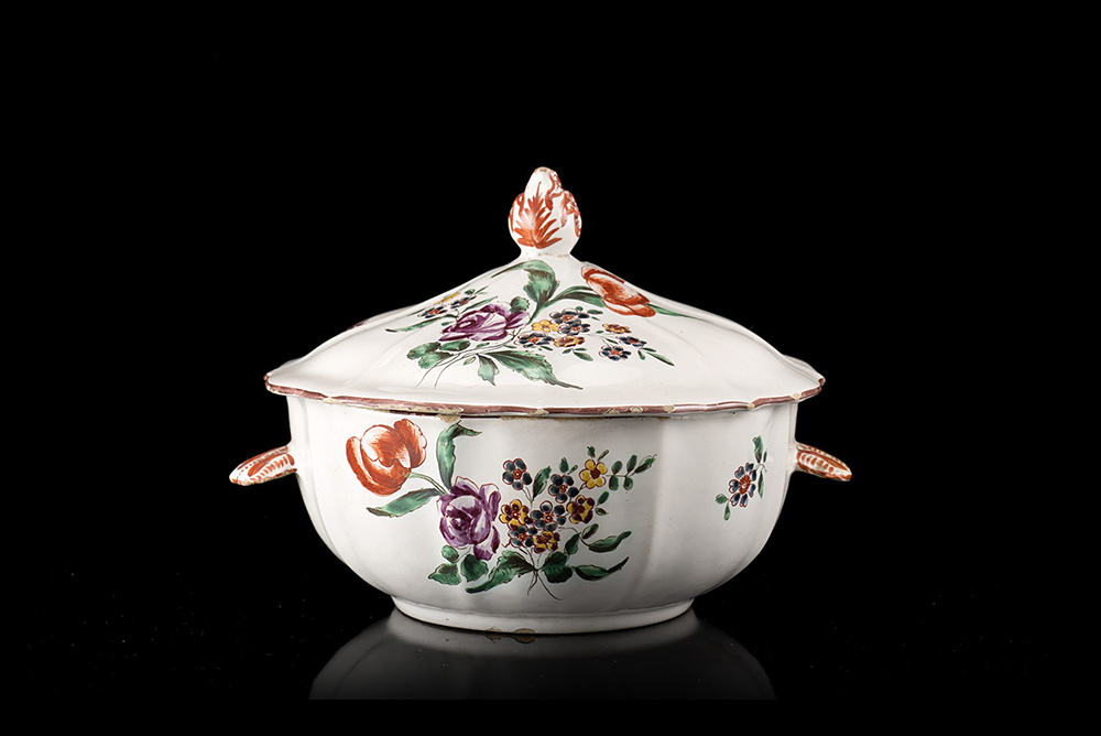 Tazza tonda da brodo con coperchio in maiolica policroma con decorazione floreale. Presa a pomolo foggiata a bocciolo di fiore. Manici a conchiglia rovesciata. Lodi, sec. XVIII (restauri) A majolica polychrome decorated cup with cover. Lodi, 18th century