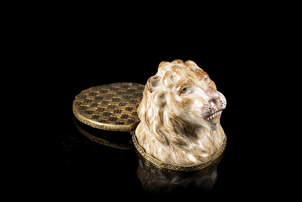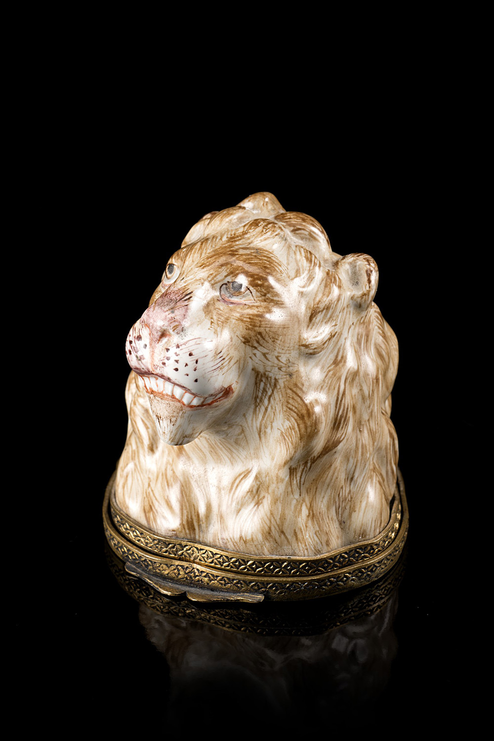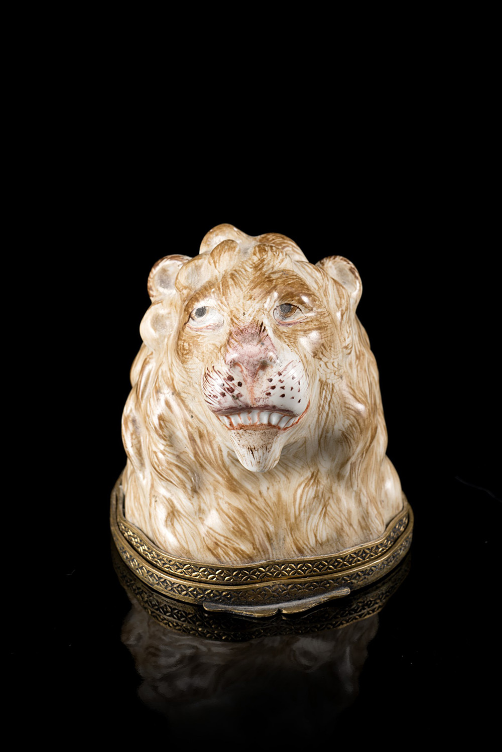 Piccola scatola in porcellana plasmata a testa di leone e montata in metallo dorato. Inizio sec. XIX (h. cm 7) A porcelain and gilt-metal box (h. cm 7) Early 19th century