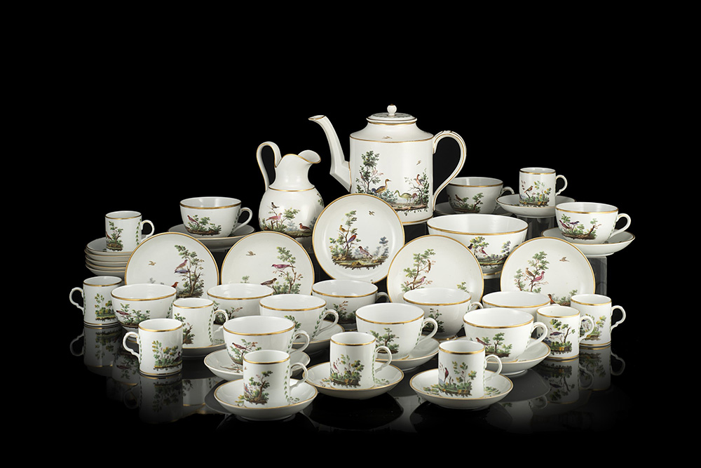 Lotto composto da dodici tazze con piattini, una ciotola (d. cm 15), una lattiera (h. cm 18), dieci tazzine da caffË a ílitroní con piattino in porcellana ed una caffettiera. Decoro policromo ornitologico a tutta superficie. Bordi dorati. Manici a voluta arricchiti da dorature. I manici sono racchiusi da una ghirlanda ovale a foglie. Il lotto Ë omogeneo per decoro ma Ë costituito da pi˘ insiemi. Marche di fabbrica: stella in oro e stella in rosso. Doccia Manifattura Ginori, periodo Carlo Leopoldo Ginori, sec. XVIII/XIX (usure alle dorature e ad alcune scene dipinte dei piattini. Caffettiera con estesi restauri. Lattiera con felature passanti sul fondo) Il decoro a volatili in paesaggio boschivo Ë tratto dallíopera sugli uccelli del naturalista francese Buffon. Il decoro ornitologico a fascia continua Ë presente su una tazza da brodo con coperchio pubblicata in ëIl Museo delle porcellane di Docciaí, a cura di G. Liverani, edito dalla Societ‡ Ceramica Richard-Ginori, 1967, tav. CVII. Part of an assembled porcelain set. Doccia, Ginori manufacture, 18th/19th century (wear, restorations and cracks)