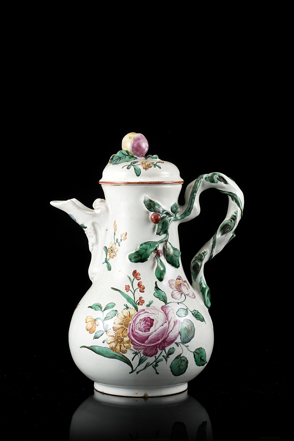 Caffettiera in maiolica con decorazione al terzo fuoco ëalla rosaí. Manico a torciglione dipinti ad intreccio di rami che superiormente si innestano sulla caffettiera con frutti e foglie a rilievo. Versatore aggettante. Bologna, manifattura Finck, sec. XVIII (h. cm 22,5) (rottura, felature e piccoli restauri) A majolica coffee pot. Bologna, Finck manufacture, 18th century (h. cm 22,5) (cracks and minor restorations)