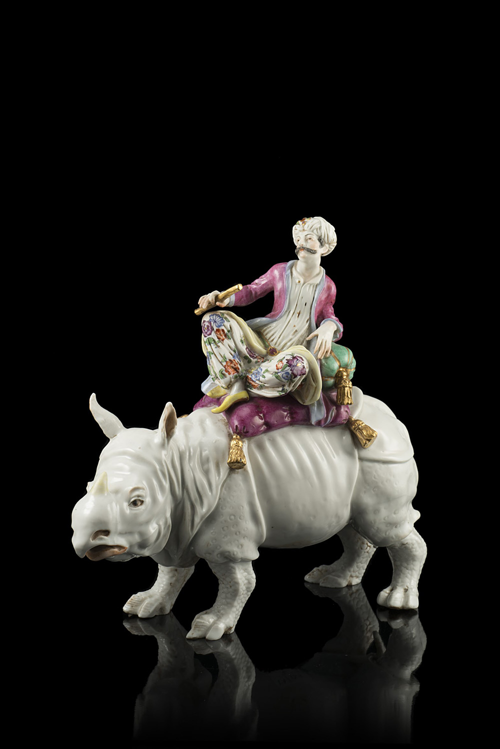 Gruppo in porcellana raffigurante un Turco su rinoceronte decorato in policromia e dorature nella veste e sulla sella (h. cm 23) Marca di fabbrica poco leggibile al retro su una zampa. Manifattura europea sec. XIX (lievi difetti) A polychrome decorated sculpture (h. cm 23) European manufacture, 19th century (minor defects)
