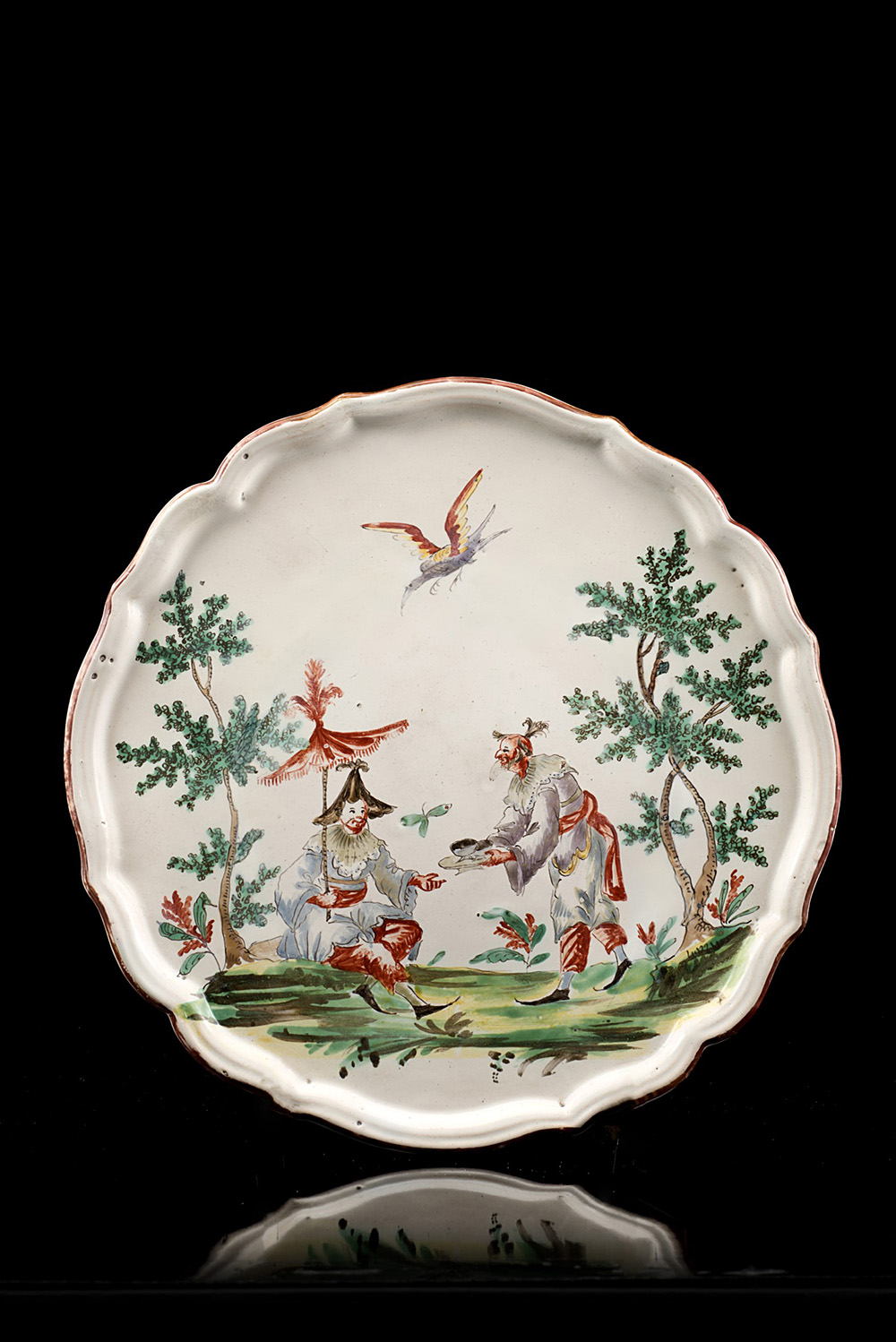 Alzata mistilinea in maiolica con profilo al bordo in rosso-bruno. Decoro policromo a tutta superficie a ëpaesini e figure a smaltoí con figure di cinesi in un giardino delimitato da due alberi. Milano, manifattura Felice Clerici, 1770 circa (d. cm 23,5) (restauri) Per il decoro si veda R. Ausenda, a cura di, ëMuseo díArti Applicate, Le Ceramicheí, Milano, 2002, Tomo II. A polychrome decorated majolica centrepiece. Milan, Felice Clerici manufacture, 1770 circa (d. cm 23,5) (restorations)