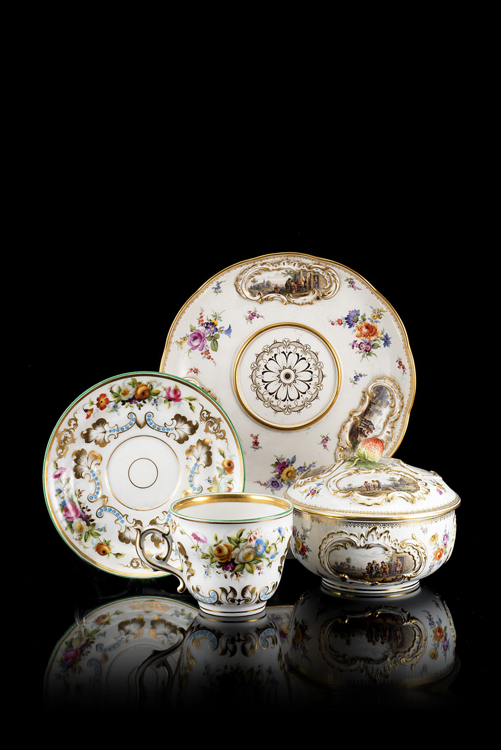 Tazza da brodo con piatto polilobato in porcellana policroma con decorazione a riserve barocche in rilievo. Ricchi profili a pizzetto in oro. Le riserve rilevate, impreziosite da rialzi in oro, incorniciano paesaggi animati di vita contadina. Tra le riserve sono dipinti mazzetti di fiori policromi. Pomolo del coperchio a frutto. Marca di fabbrica in blu sottovernice. Meissen, sec. XIX (h. cm 15) Unita a una tazzina da caffË con piattino in porcellana tenera con decorazione policroma. Sec. XIX A porcelain cup with dish, Meissen 19th century (h. cm 15) and a porcelain coffee cup with saucer of the 19th century