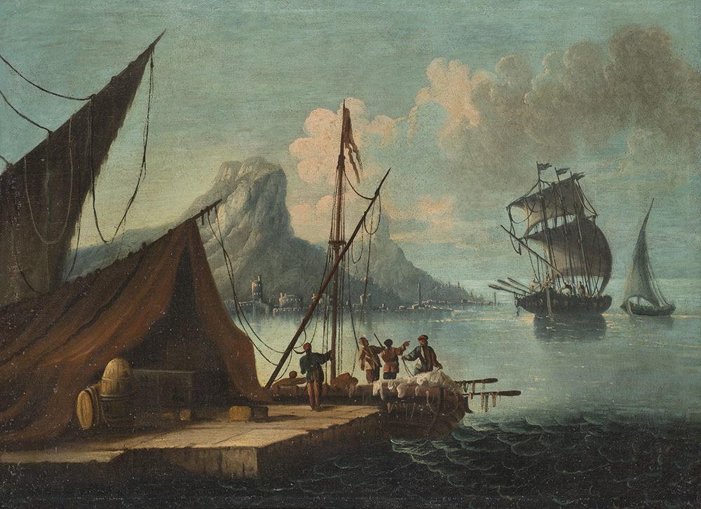Paolo Maria Antoniani (Milano 1735 - Torino 1807) (attr.) "Scorcio di porto con pescatori e velieri" olio su tela (cm 74x100) In cornice Paolo Maria Antoniani (Milan 1735 - Turin 1807) (attributed to) "Seascape with figures" oil on canvas (cm 74x100) Framed