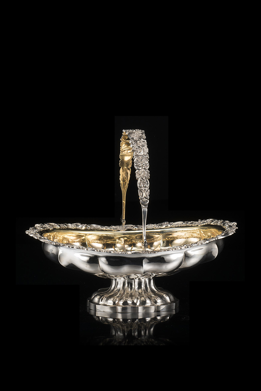 Cestino in argento di forma ovale, piede e corpo baccellati e costolati, bordura e manico decorati a volute fogliate; interno in argento dorato. Argentiere F.G. San Pietroburgo, 1840 (cm 30x23,5) (gr 840 ca.) (lievi difetti) A silver basket. Silversmith F.G. Saint Petersburg, 1840 (cm 30x23x5) (gr 840 circa) (minor defects)