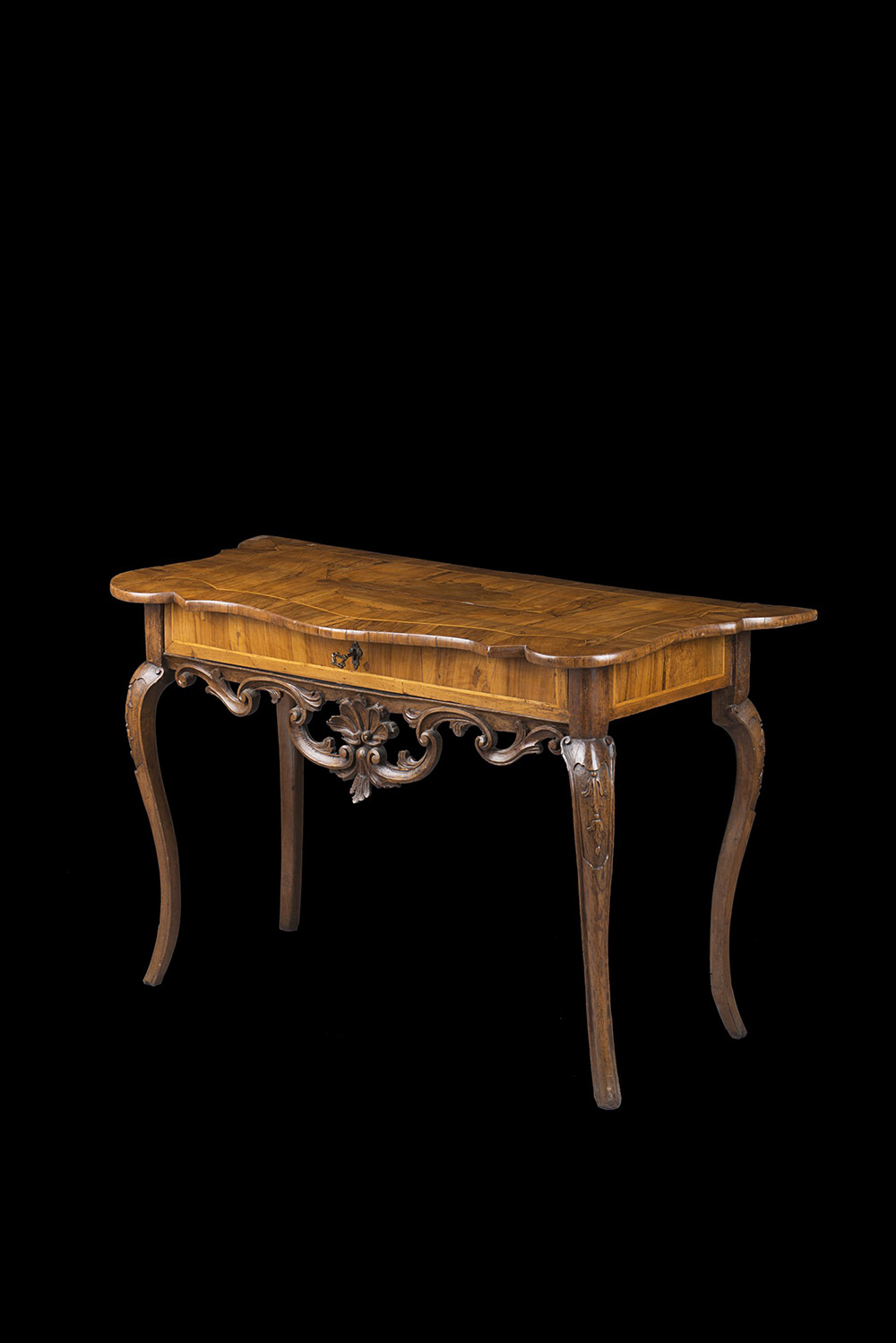 Tavolo da parete lastronato in radica di noce e filettato in legno chiaro, piano mosso, un cassetto nella fascia, gambe intagliate, grembiale con girali di foglie. Lombardo-Veneto, sec. XVIII (cm 57x75x128) (difetti) A burr walnut side table. Lombardo-Veneto, 18th century (cm 57x75x128) (defects)