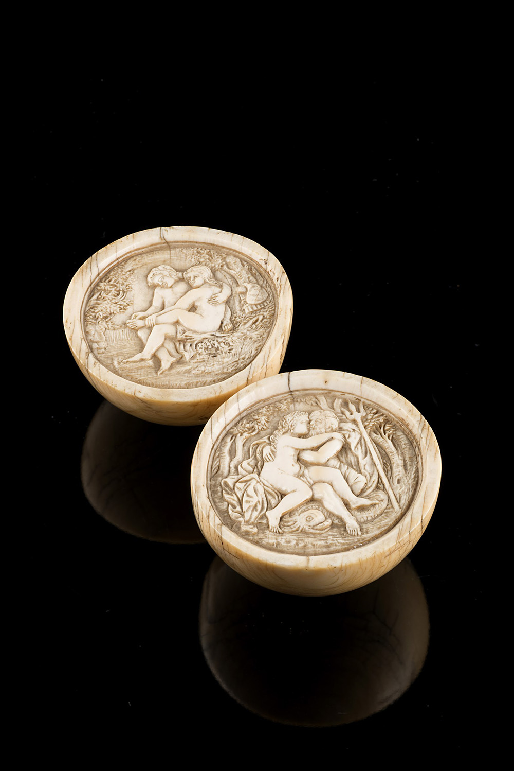 Due semisfere in avorio intagliato raffiguranti scene erotiche. Sec. XIX (d....
