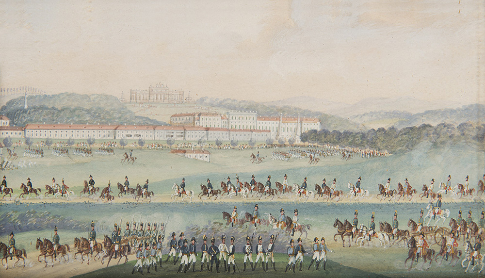 Balthasar Wigand (Vienna 1770 - Felixdorf 1846) "Kaiser Napoleon mit seinen stube vor dein lerstschlasse schonbrum in Wien" miniatura a tempera su carta (cm 9,5x14,5). Firmata in basso a destra e titolata al centro. In cornice Balthasar Wigand (Vienna 1770 - Felixdorf 1846) "Kaiser Napoleon mit seinen stube vor dein lerstschlasse schonbrum in Wien" miniature on paper (cm 9,5x14,5) Signed and framed