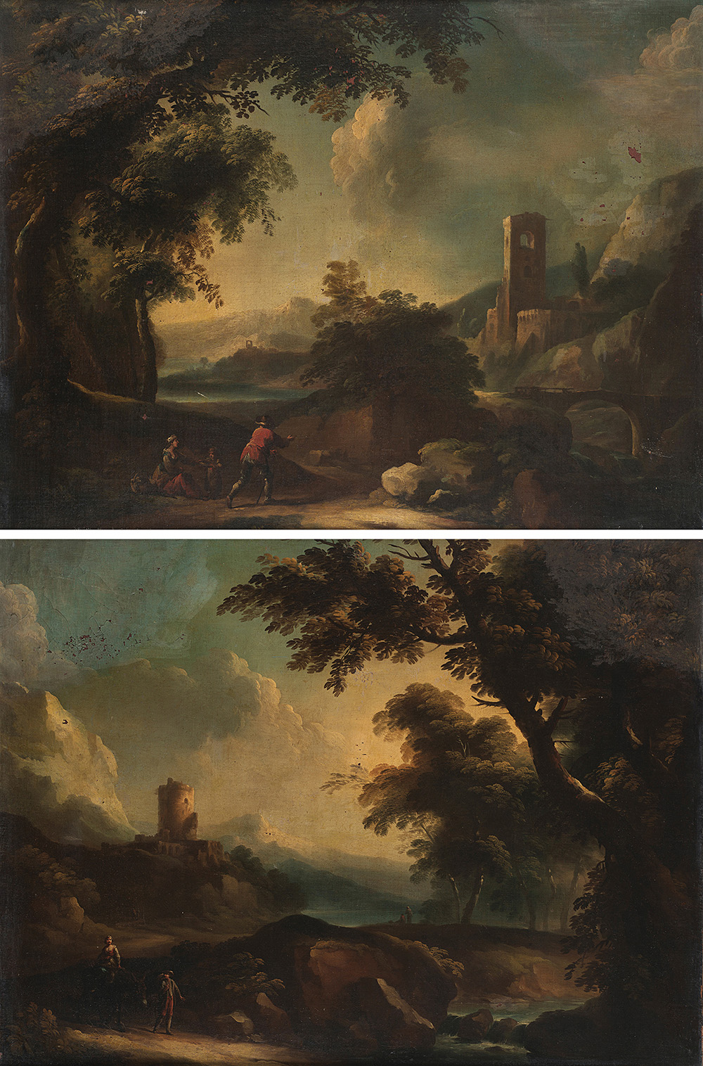 Scuola Veneta, sec. XVIII "Coppia di paesaggi con viandanti e torre" olio su tela (cm 90x115) Venetian school, 18th century "A pair of landscape with figures" oil on canvas (cm 90x115)