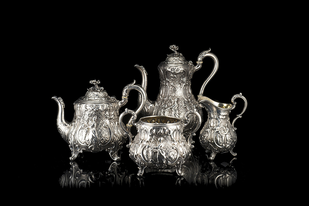 Servizio da tË e caffË in argento composto da caffettiera, teiera, zuccheriera e lattiera, con corpi piriformi decorati con 'cineserie', piedini fogliati, manici a doppia voluta, pomoli a fiore. Argentiere John Samuel Hunt. Londra, 1856 (h. max cm 24)(gr 2480 ca.) (difetti) A silver coffee and the service. Silversmith John Samuel Hunt. London, 1856 (h. max cm 24) (gr 2480 circa) (defects)