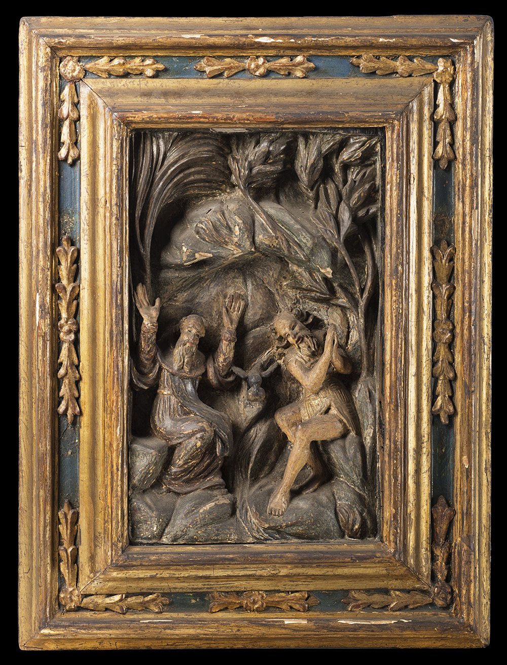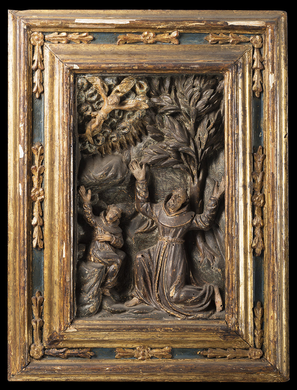Scuola del sec. XVII "San Gerolamo e San Francesco" e "San Francesco riceve le Stigmate" due bassorilievi in legno scolpito e laccato entro cornice tripartita in legno intagliato, dipinto e dorato (cm 50x38) (difetti e mancanze) 17th-century school "Saint Jerome and Saint Francis" and "Saint Francis receiving the Stigmata" two lacquered and carved wood bas reliefs (cm50x38) (defects and losses)