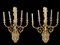 Coppia di appliques a cinque luci in legno intagliato, laccato e dorato. Portacandele di forma sagomata decorati a volute. Montanti scolpiti a fiocchi nella parte superiore e a mascheroni e fiori nella parte inferiore. Inizio sec. XVIII (h. cm 110) (difetti e restauri) A pair of giltwood five-light appliques. Early 18th century (h. cm 110) (defects and restorations)