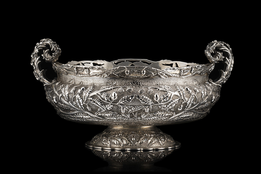 Centrotavola in argento di forma ovale con corpo sbalzato e cesellato a rami, foglie e ghiande su fondo zigrinato, ripetuti sul piede sagomato, sulla bordura traforata e sulle prese verticali a ricciolo. Milano, argentiere Leguti Ettore, anni '50 del sec. XX (cm 45x24x26) (gr 2850 ca.) (lievi difetti) A silver centrepiece. Milan, silversmith Leguti Ettore, '50s of the 20th century (cm 45x24x26) (gr 2850 circa) (minor defects)