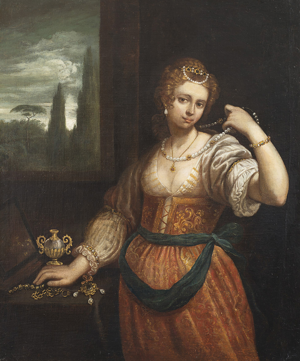 Maestro nordico operante a Venezia nel sec. XVII "Ritratto di gentildonna con collana e gioielli" olio su tela (cm 83x70) In cornice (difetti e restauri) 17th-century Norther Master works in Venice"Gentlewoman with jewellery" oil on canvas (cm83x70) In old frame