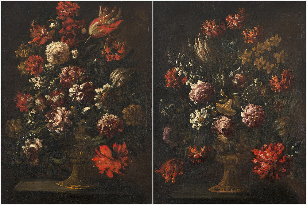 Maestro veneto del secolo XVII "Vasi con fiori" coppia di olii su tela (cm 64x48) In cornice 17th-century Venetian master "Vases with flowers" a pair of oil on canvas (cm 64x48) Framed
