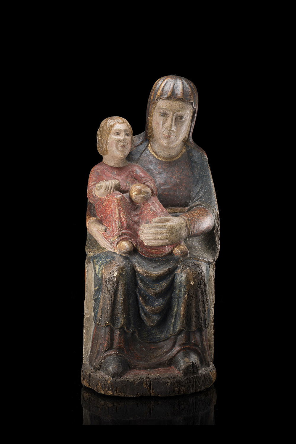 Arte del sec. XVI "Madonna con Bambino" scultura in legno policromo (h. cm 75) (difetti e restauri) 16th-century art "Virgin and Child" polychrome decorated sculpture (h. cm 75) (defects and restorations)