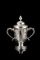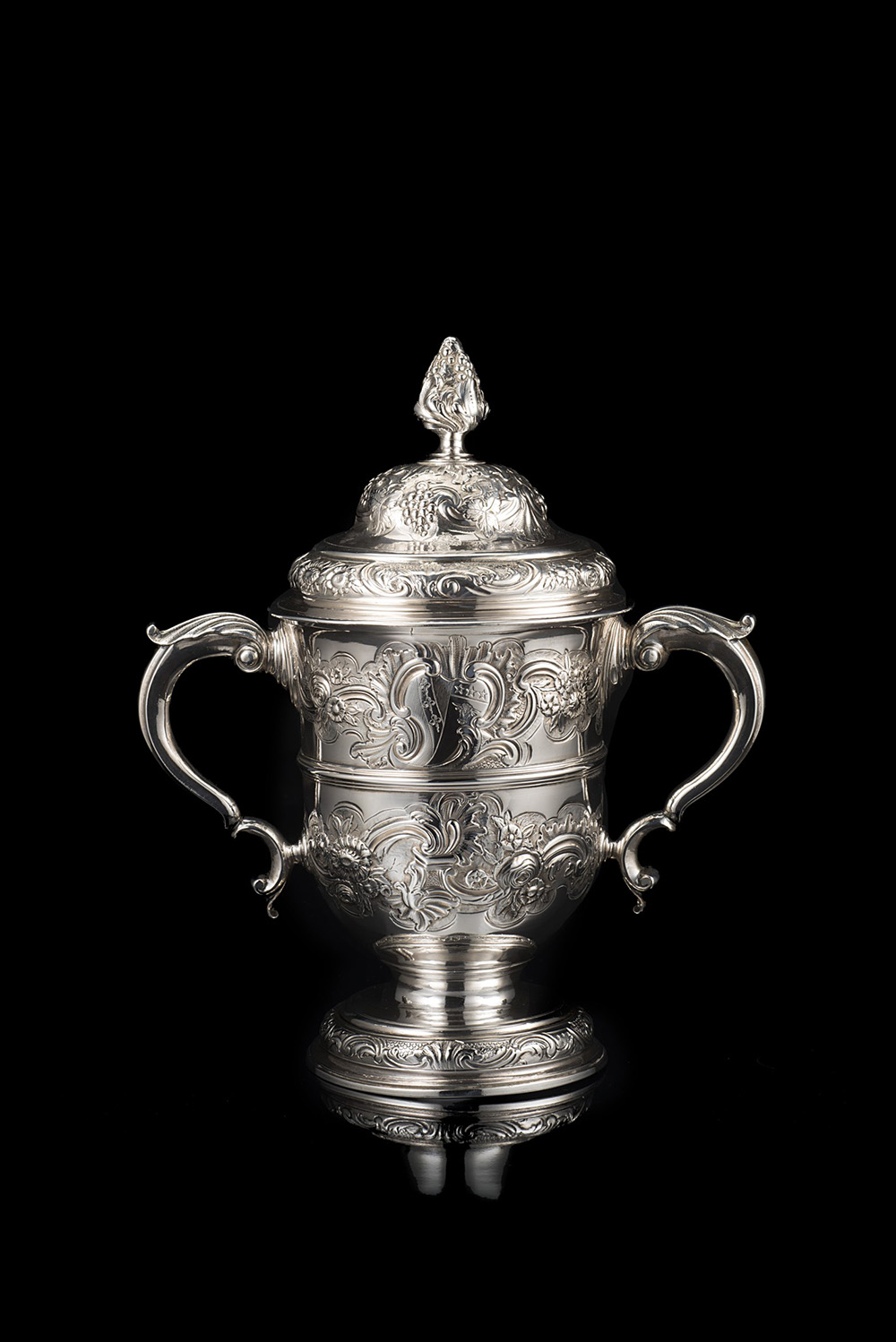 Coppa in argento a due manici con corpo modanato, piede e coperchio bombati e gradinati, decorata da volute, motivi floreali e fitomorfi e stemma nobiliare; prese a doppia voluta con creste fogliate. Londra, 1746. Argentiere Thomas Whipham (h. cm 30) (gr 1480 ca.) (difetti) A silver bowl. London, 1746. Silversmith Thomas Whipham (h. cm 30) (gr 1480 ca.) (defects)