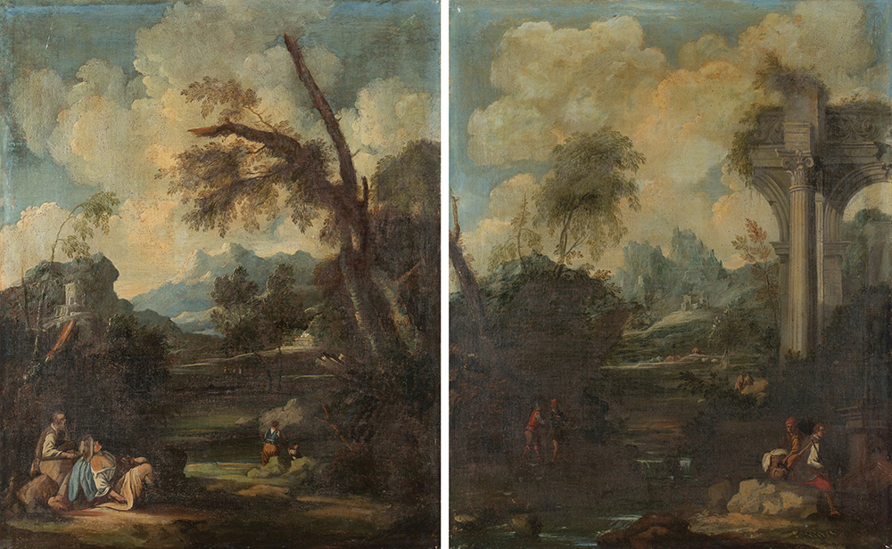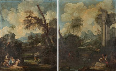 Ambito di Antonio Francesco Peruzzini, secolo XVIII "Paesaggio con architetture e viandanti in sosta" coppia di dipinti ad olio su tela (cm 73x58) In cornici (difetti e restauri) 17th-century circle of Antonio Francesco Peruzzini, "Landscape with Architectures and Peasants" a pair of oil on canvas (cm 73x58) Framed (defects and restorations)