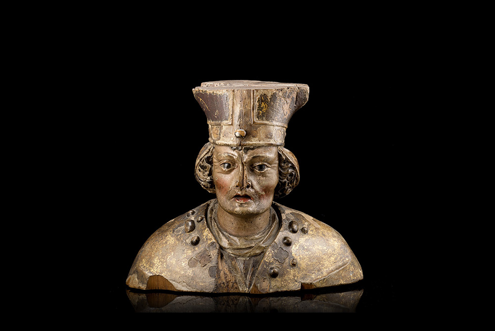 Scultura in legno dorato e dipinto raffigurante il busto di un doge. Sec....