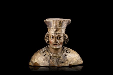 Scultura in legno dorato e dipinto raffigurante il busto di un doge. Sec. XVIII (h. cm 36) (difetti e mancanze) A painted and gilt wood sculpture. 18th century (h. cm 36) (defects and losses)