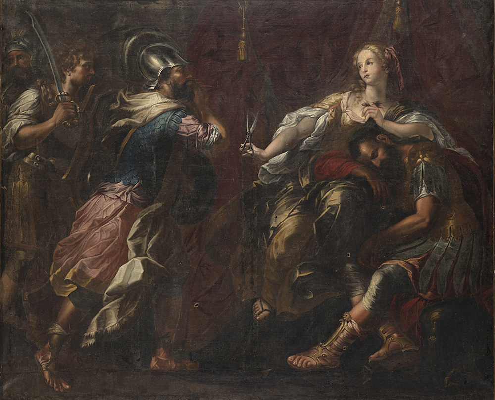 17th-century Bolognese master "Samson and Delilah" oil on canvas (cm 203x243) (defects and restorations) Framed