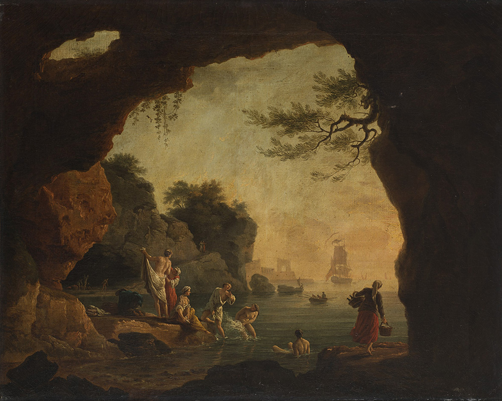 Seguace di Claude-Joseph Vernet della fine del secolo XVIII "Diana e ninfe al bagno" olio su tela (cm 66x81) In cornice A follower of Claude-Joseph Vernet, the end of XVIII century "The bath of Diana and nymph" oil on canvas (cm 64x81,6) Framed
