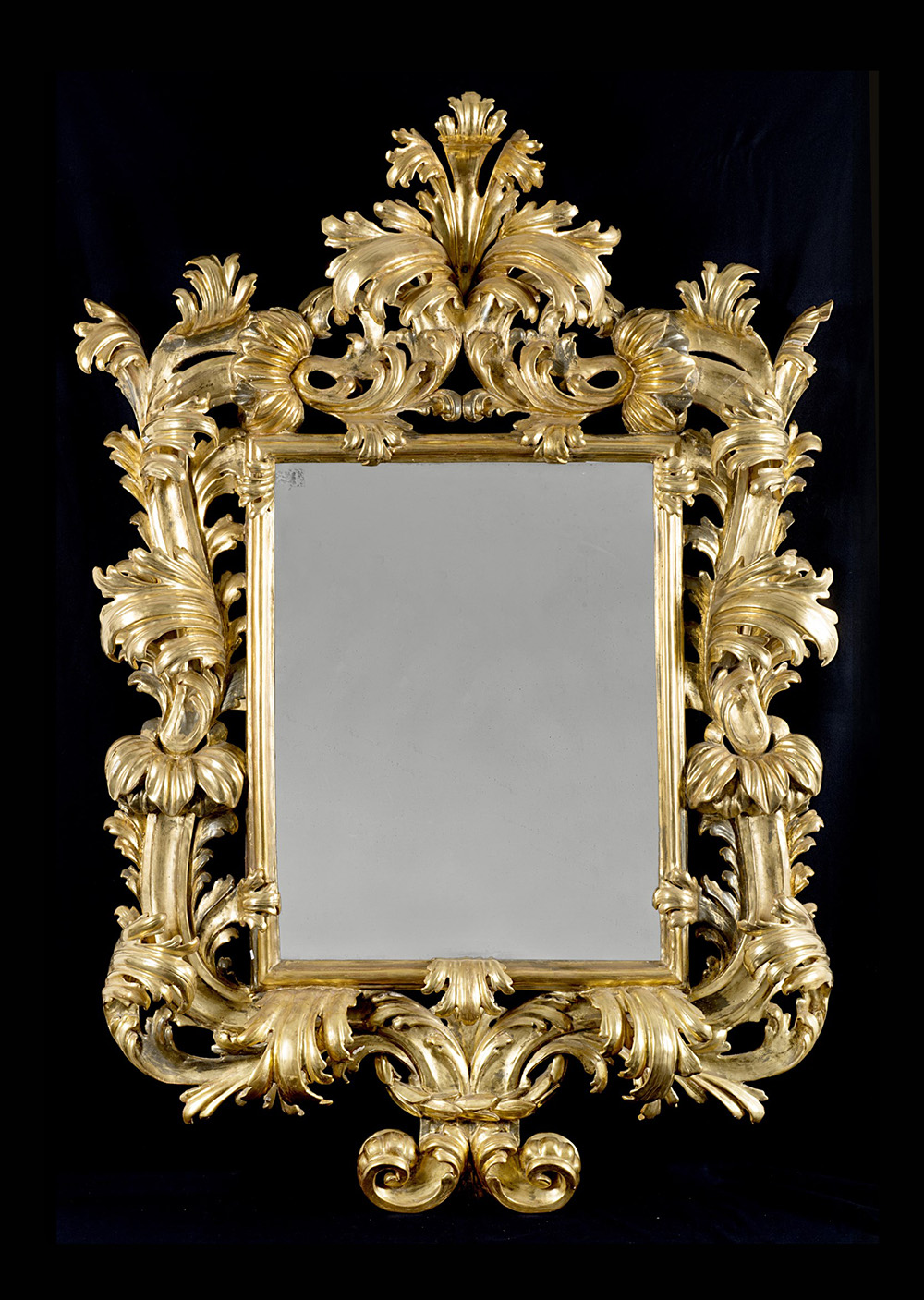 Grande specchiera barocca in legno dorato e riccamente scolpito a motivi fogliati e fregi a ricciolo. Sec. XVII (doratura di epoca posteriore e lievi difetti) A large carved giltwood mirror. 17th century (gilt of a later date, minor defects)