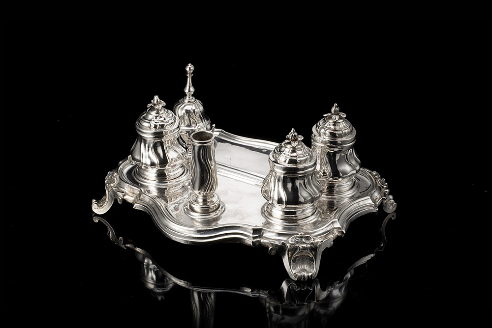 Calamaio in argento con base rettangolare mistilinea e gradinata, sorretta da quattro piedini a voluta fogliata, con tre contenitori ed un campanello con corpo a balaustro ed un portapenne cilindrico, costolati e baccellati e pomoli vegetali. Napoli, 1761. Bollo di Giuseppe Palmentiero (cm 30x23) (gr netti 1120 ca.) (difetti) A rectangular silver inkwell. Naples, 1761. Mark of Giuseppe Palmentiero (cm 30x23) (gr 1120 ca.) (defects)