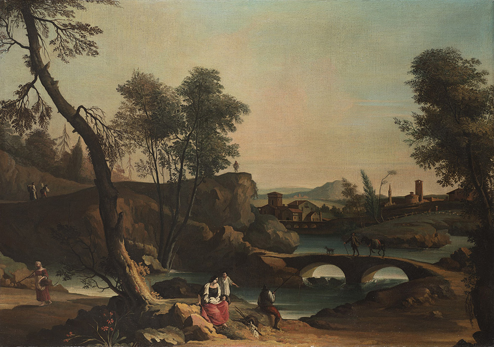 Scuola veneta del secolo XVIII "Paesaggio fluviale con pescatori" olio su tela (cm160x110) In cornice Venetian school of XVIII century "Landscape with fishermen" oil on canvas (cm 160x110) framed