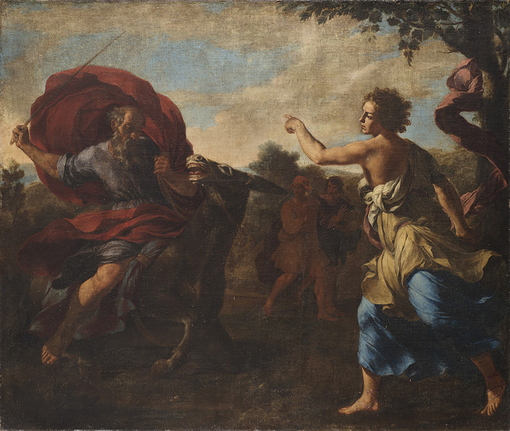 Scuola napoletana del secolo XVII "Angelo che appare a Baalam" olio su tela (cm 121,5x145) (difetti e restauri) In cornice