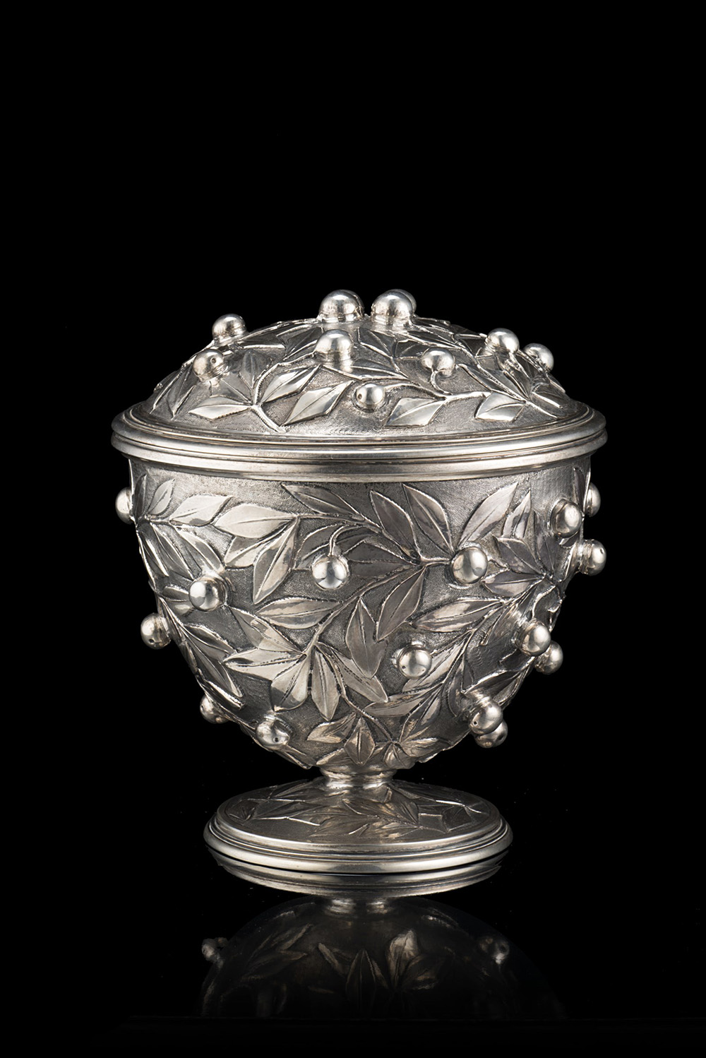 Coppa in argento con coperchio decorata con rami di ciliegio e frutti....