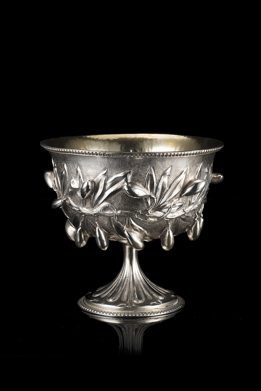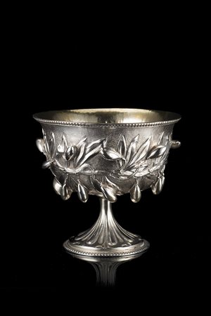 Coppa in argento ispirata agli antichi modelli pompeiani, con piede scanalato e corpo decorato da rami d'olivo sbalzati con frutti ad altorilievo su fondo puntinato. Milano, sec. XX. Argentiere Mario Poli (h. cm 15; d. cm 17,2) (gr 540 ca.) (lievi difetti) A silver bowl. Milan, 20th century. Silversmith Mario Poli (h. cm 15; d. cm 17,2) (gr 540 ca.) (minor defects)