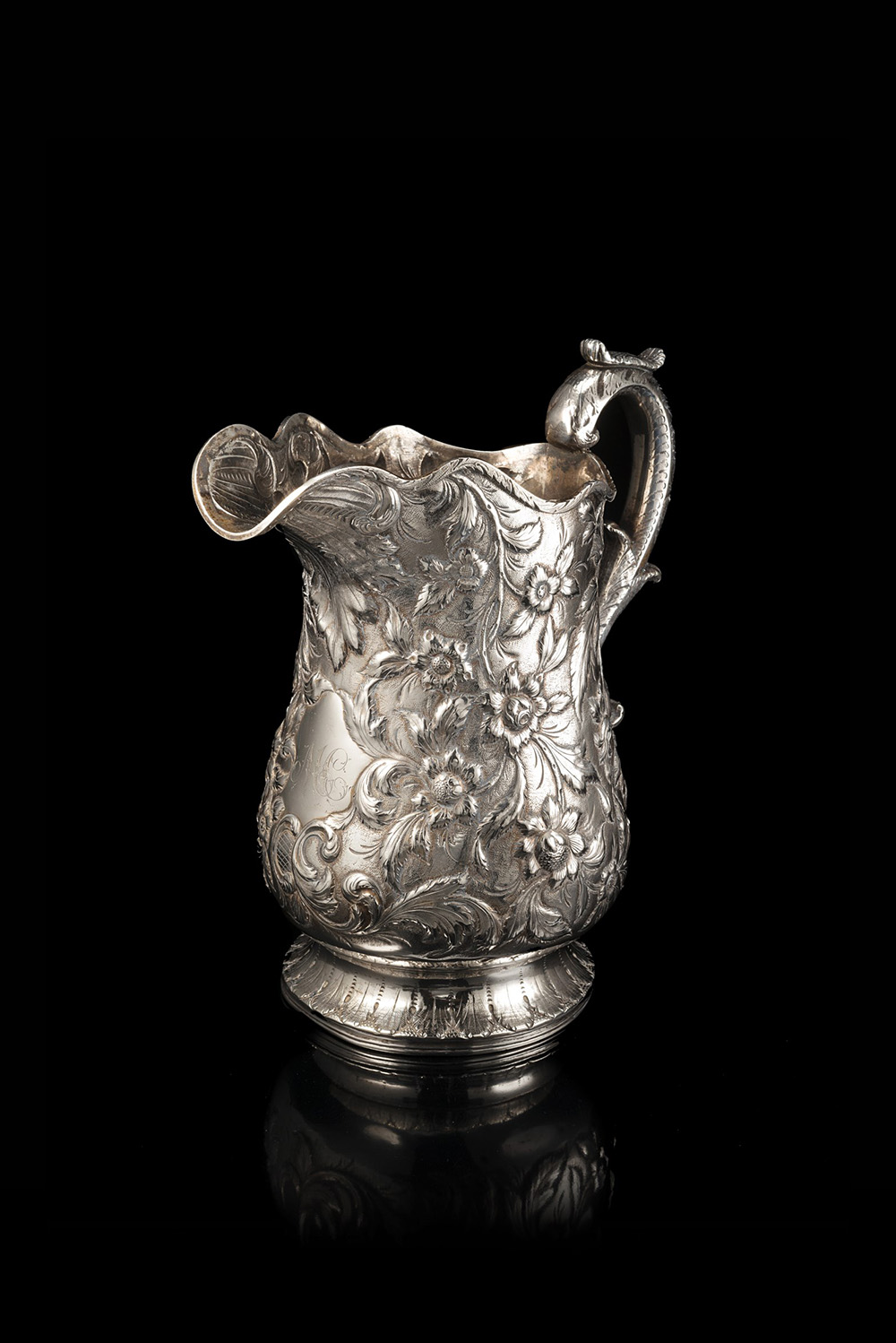 Brocca in argento sbalzata e cesellata con motivi floreali su fondo puntinato; orlo sagomato e manico ad ansa con volute fogliate. Monogramma 'MC' inciso esternamente e dedica: "Presented To. Margaret Carter. By Her Husband. August 31th 1853" incisa all'interno del piede. Stati Uniti, Baltimora. Argentiere Samuel Kirk & Son, 1846-61 (h. cm 26,5) (gr 900 ca.) (difetti) Baltimore coin silver jug with repuossË floral motives. Monogram 'MC' engraved on the outside and dedication "Presented To. Margaret Carter. By Her Husband. August 31th 1853" engraved under the foot. Silversmith Samuel Kirk & Son, 1846-61 (h. cm 26,5) (gr 900 ca.) (defects)