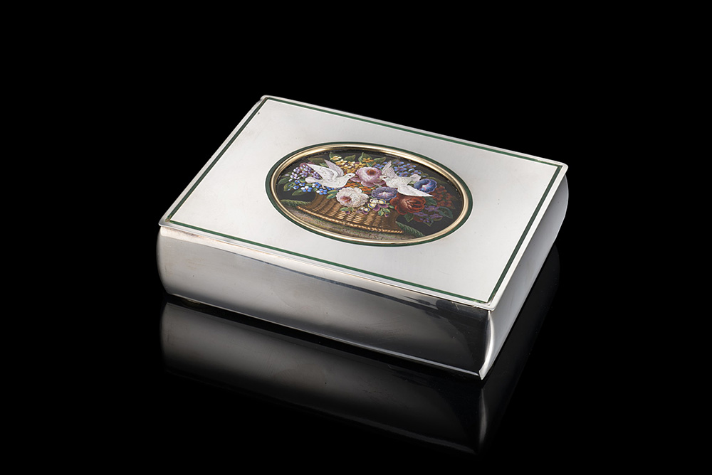 Scatola in argento di forma rettangolare, liscia, con interno in vermeil. Coperchio contenente micromosaico romano della fine del sec. XIX raffigurante cesto di fiori e colombe entro profili dorati e smaltati. Firmato G. Petocchi- Roma (cm 20x15x5,3) (peso lordo gr 1600 ca.) (lievi difetti) A rectangular silver box with micromosaic. Silversmith G. Petocchi. Roma (cm 20x15x5,3) (gr tot 1600 ca) (minor defects)