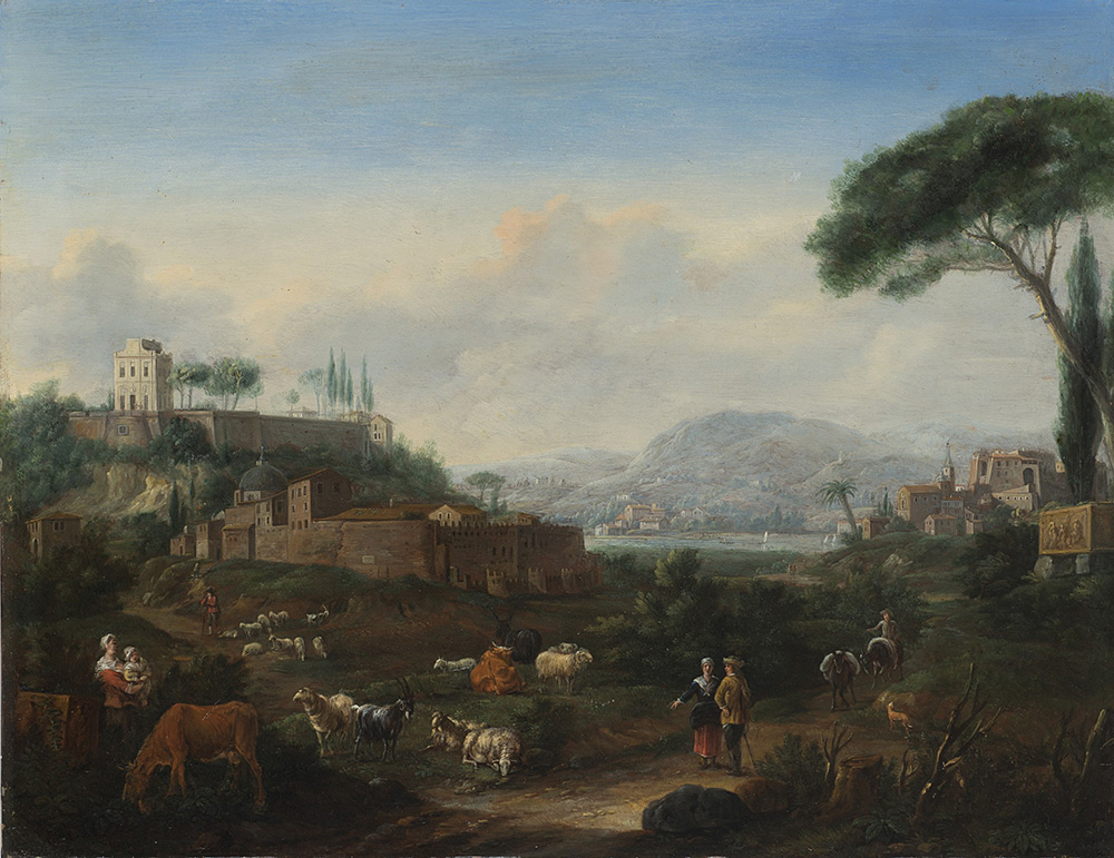 Hendrik Frans van Lint (1684 - 1763) (attr.) "Capriccio paesistico con dettagli di edifici laziali e napoletani, su uno sfondo marino e, in primo piano, figure di viandanti, pastori e armenti" olio su rame (cm 38x49) In cornice Allegata expertise del Dott. Maurizio Marini Hendrick Frans van Lint (1635-1664) "Landscape with peasants" oil on copper (cm38x49) Framed