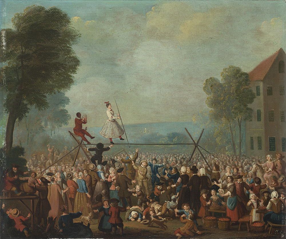 Maestro fiammingo della fine del secolo XVIII "Festa di saltimbachi" olio su tela (cm 47x55) In cornice Late 18th-century Flemish master "Acrobats" oil on canvas (cm 47x55) Framed