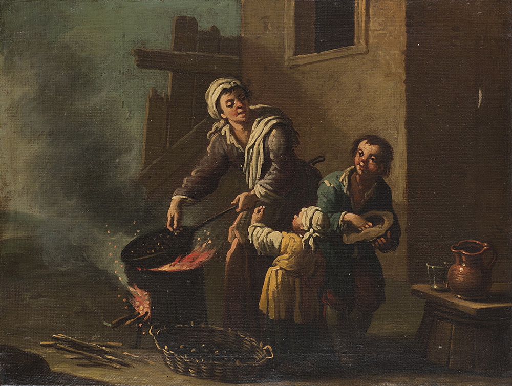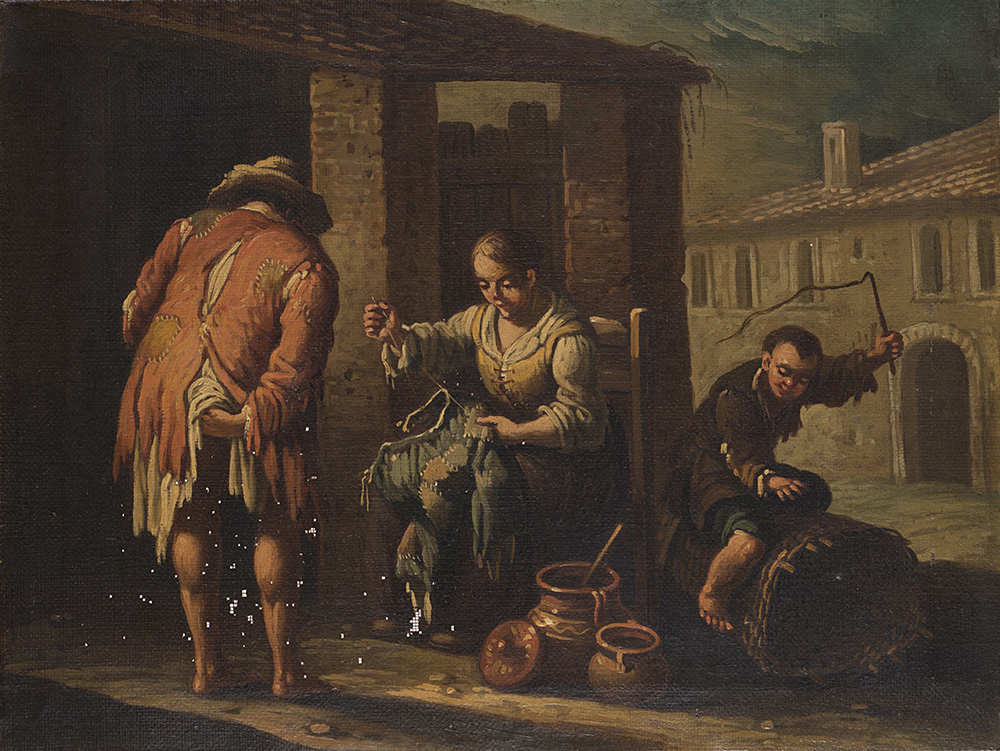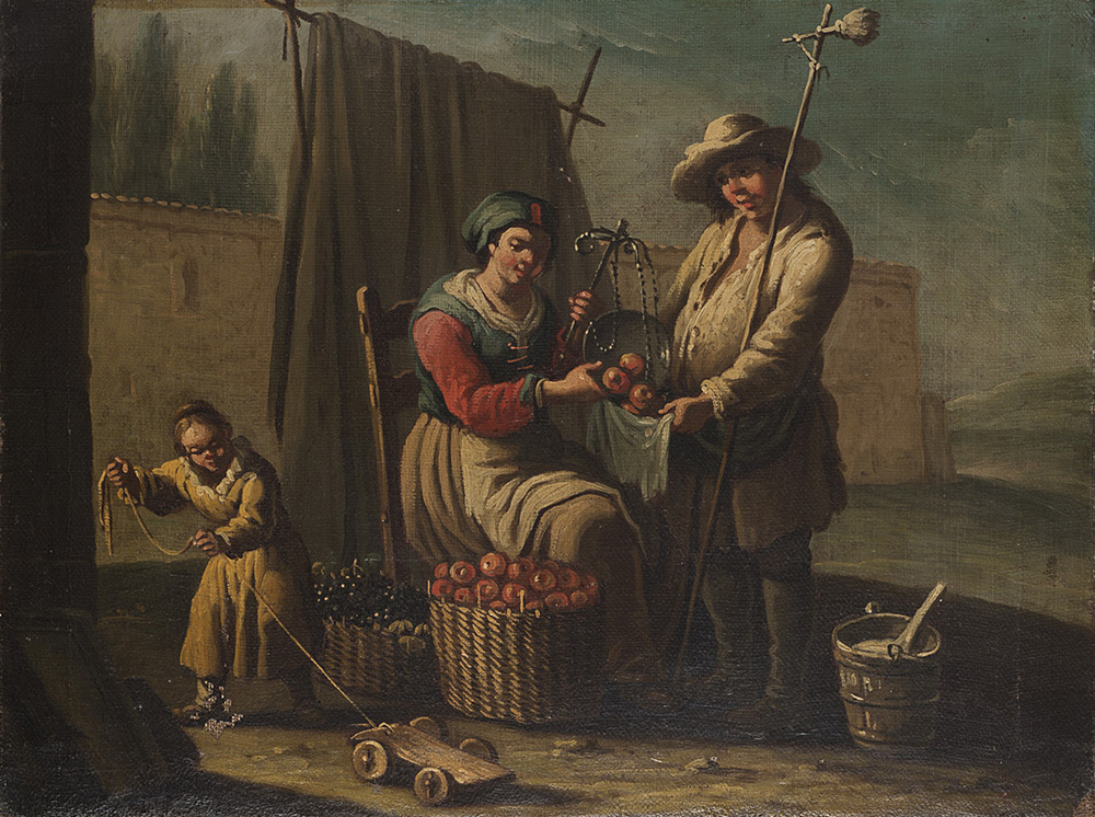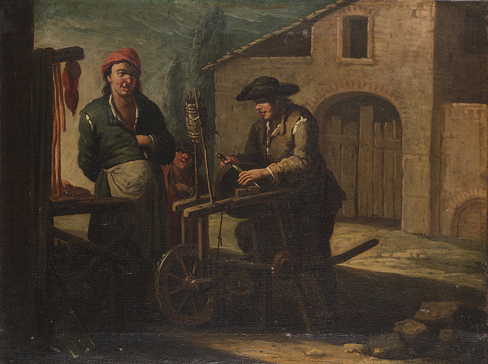 Giovanni Graneri, 18th-century, four oil paintings on canvas " Autumn, winter, the knife-grinder and seamstress" (cm 32x42) Framed